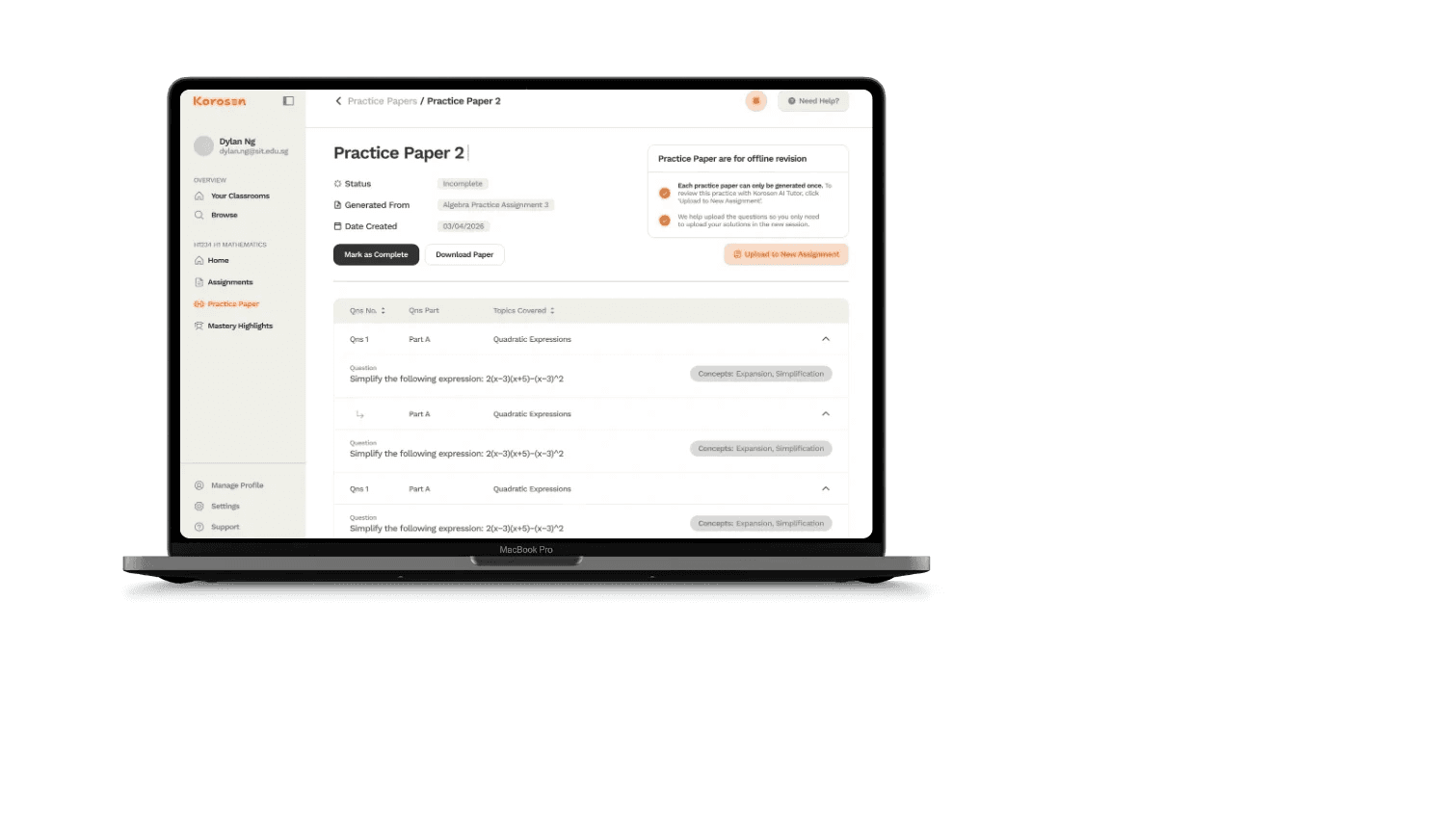 Korosen creates customised practice papers for every student, focusing on the exact topics they need to strengthen. Each set is automatically aligned to their performance data, ensuring every question counts toward real improvement.